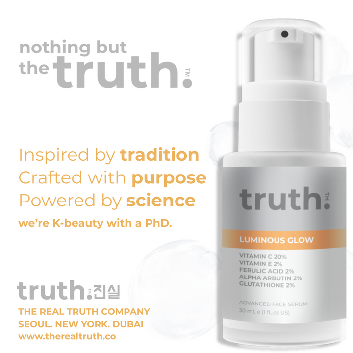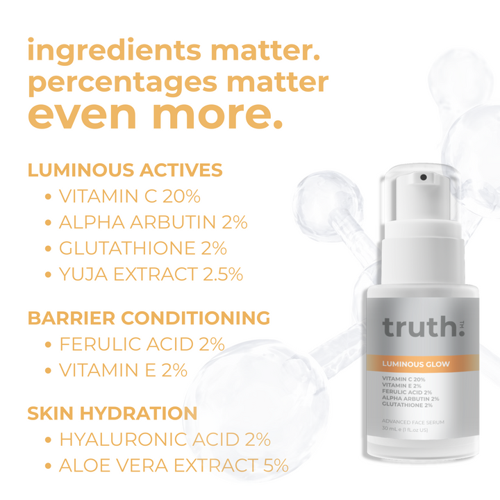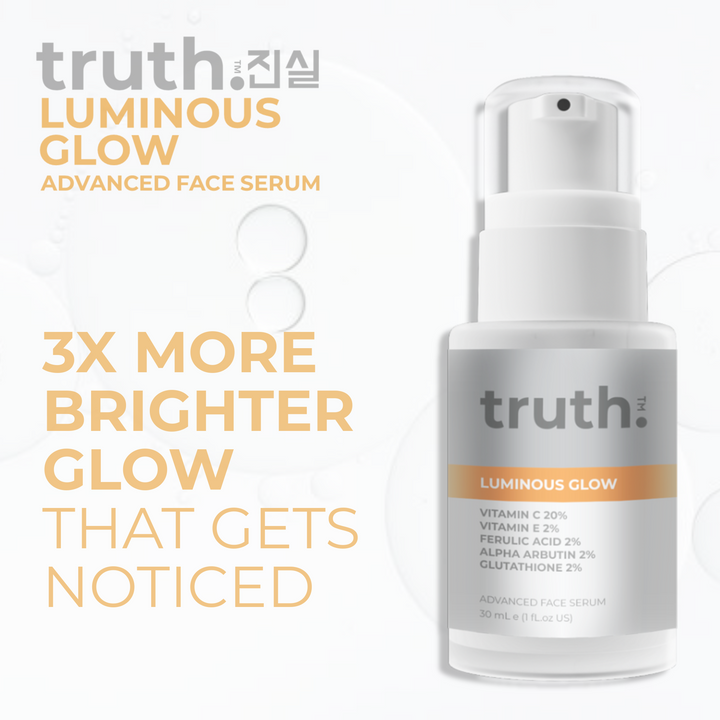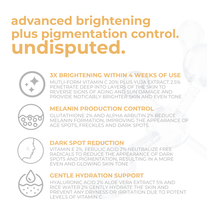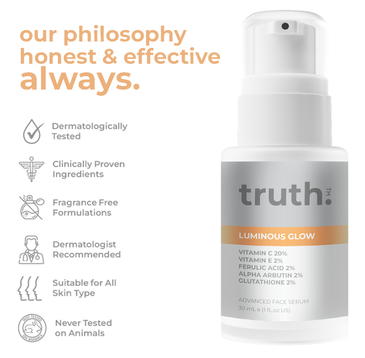 Our Luminous Glow Serum with Vitamin C 20% helps by visibly brightening the complexion and reducing signs of sun damage and photo aging.
