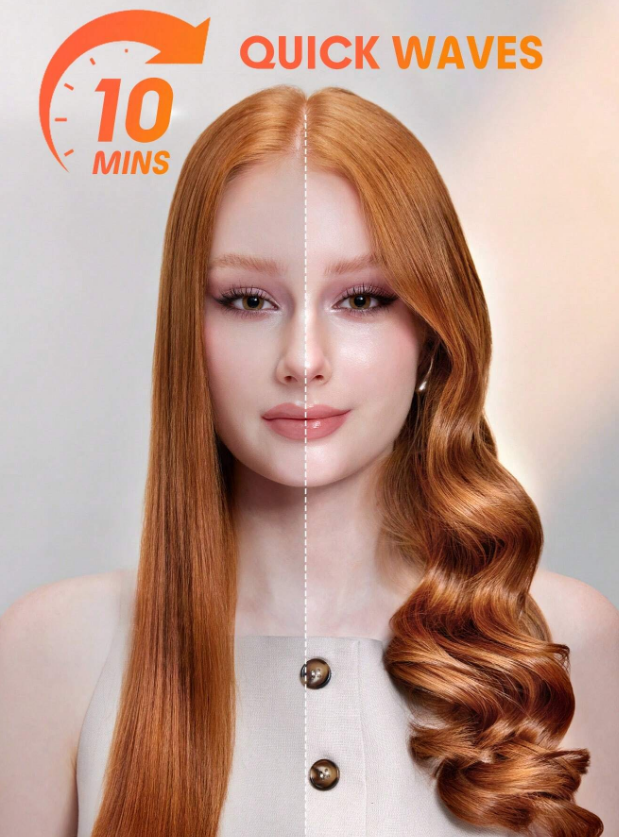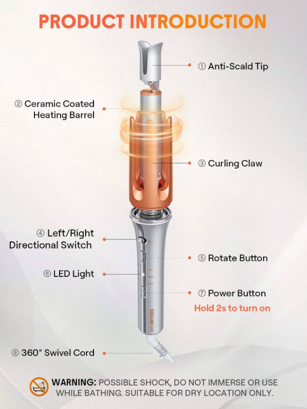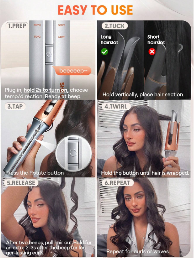 [Fast Heating, One-Button Automatic Curling] No pressure for beginners! This rotary curling iron adopts a one-button curling design. All you need to do is put a strand of hair on the curling iron, press and hold the direction button and the hair will be curled into the center area. After hearing 2 beeps, the wave is complete! It is ready to use in 60 seconds, no need to wait, and it only takes 10 minutes to curl the whole head.