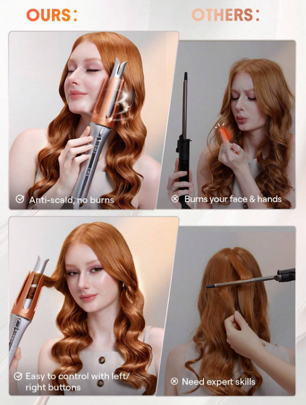 [Anti-Burn And Anti-Tangle Is Safer]Our automatic curling iron adopts a unique anti-tangle design to effectively prevent hair tangling or pulling, and protect your hair from damage. The top adopts a special anti-burn design, and the middle baffle isolates contact, which can effectively prevent burns even after long-term use, making the operation safer and suitable for beginners.