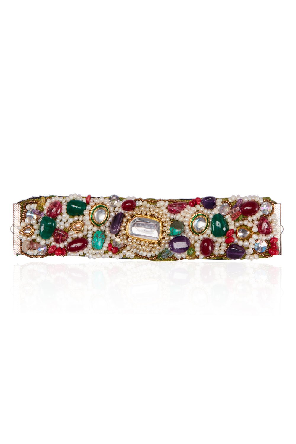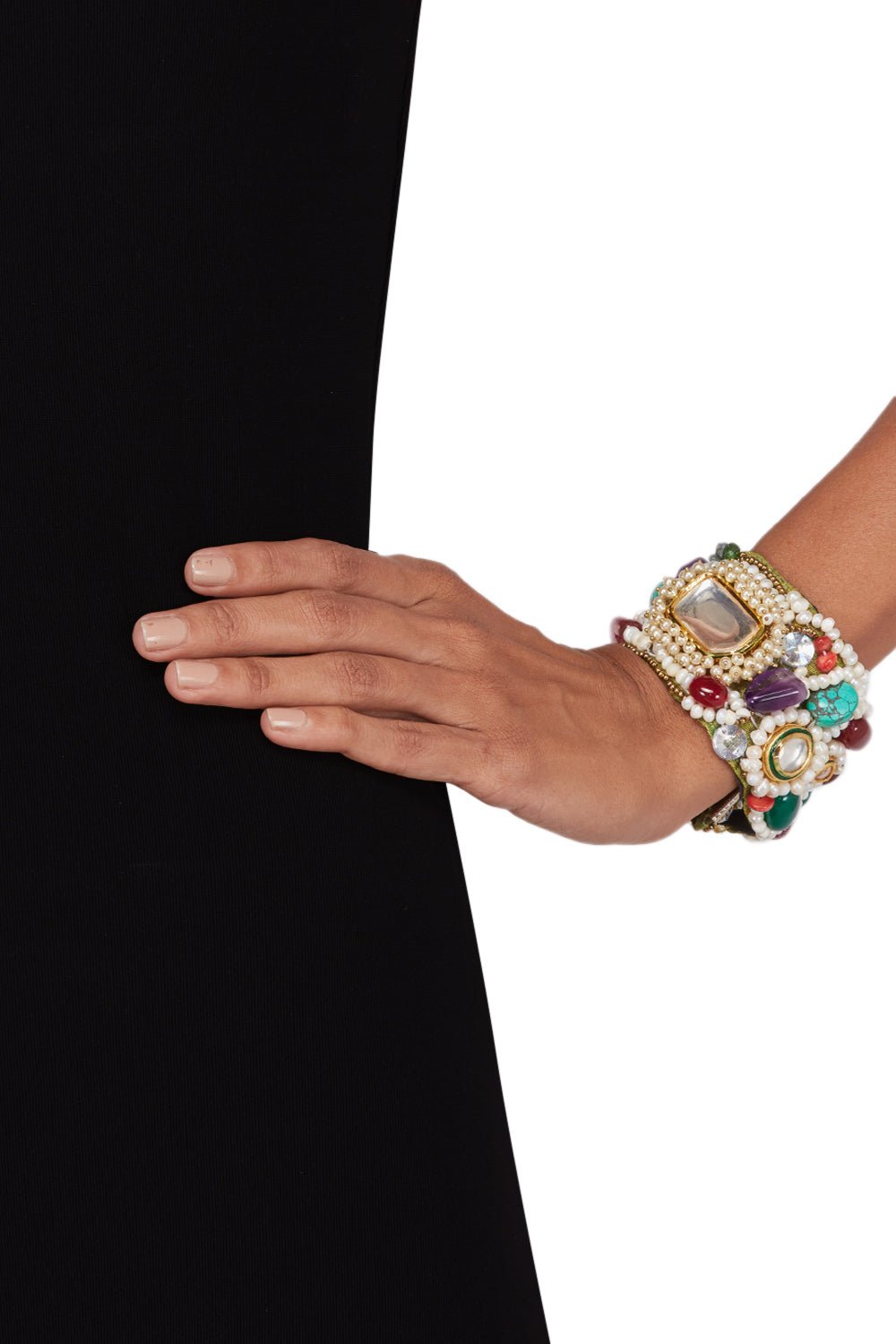 Jewelry by Janhavi designs this exquisite bracelet with polki, turquoise, tourmuline, freshwater pearls. Style it with a fusion look.