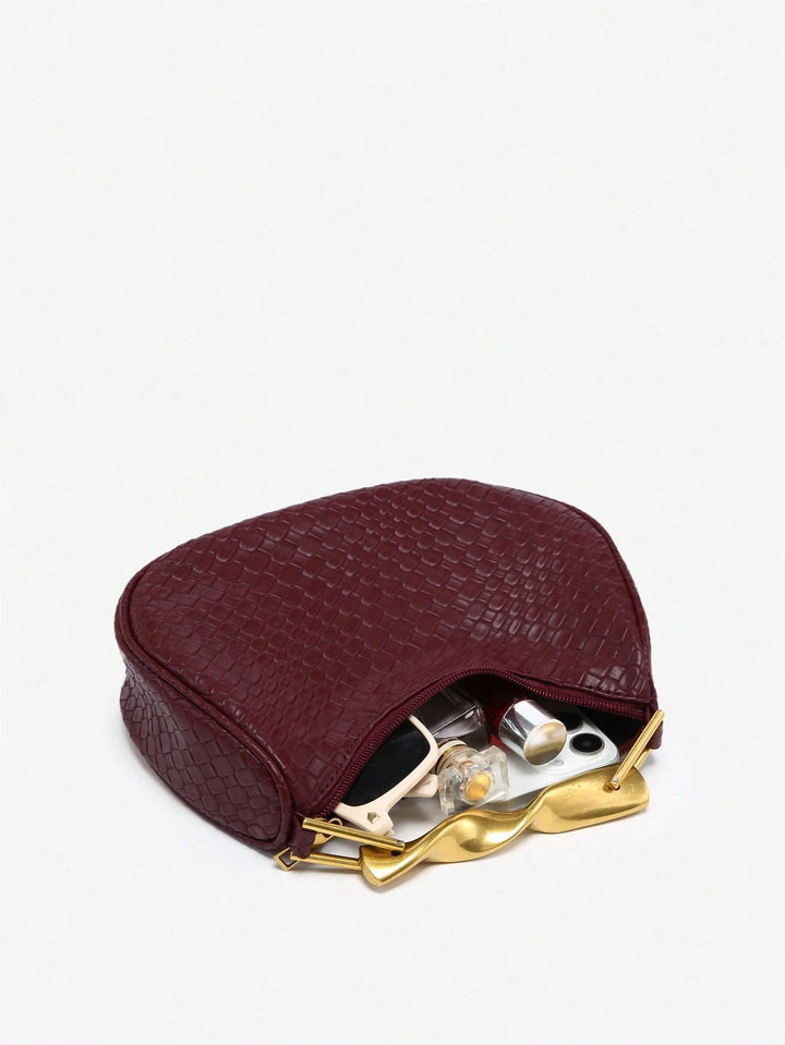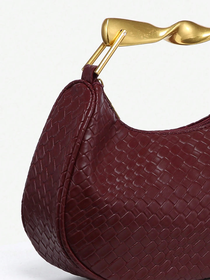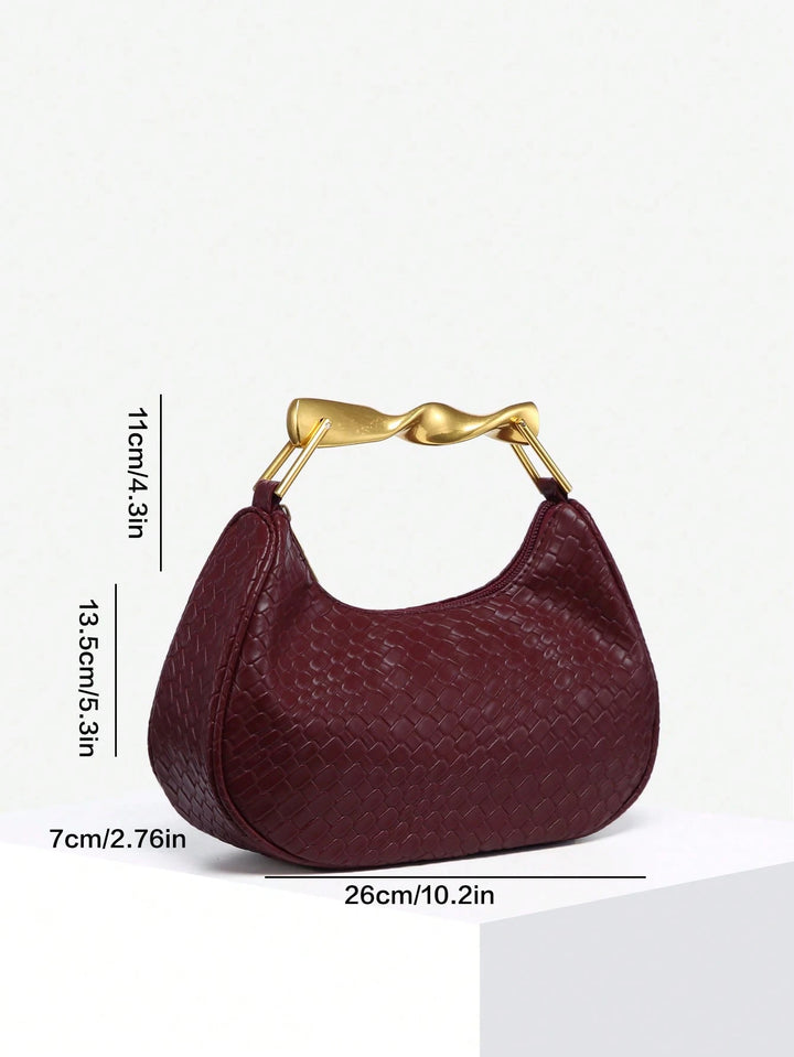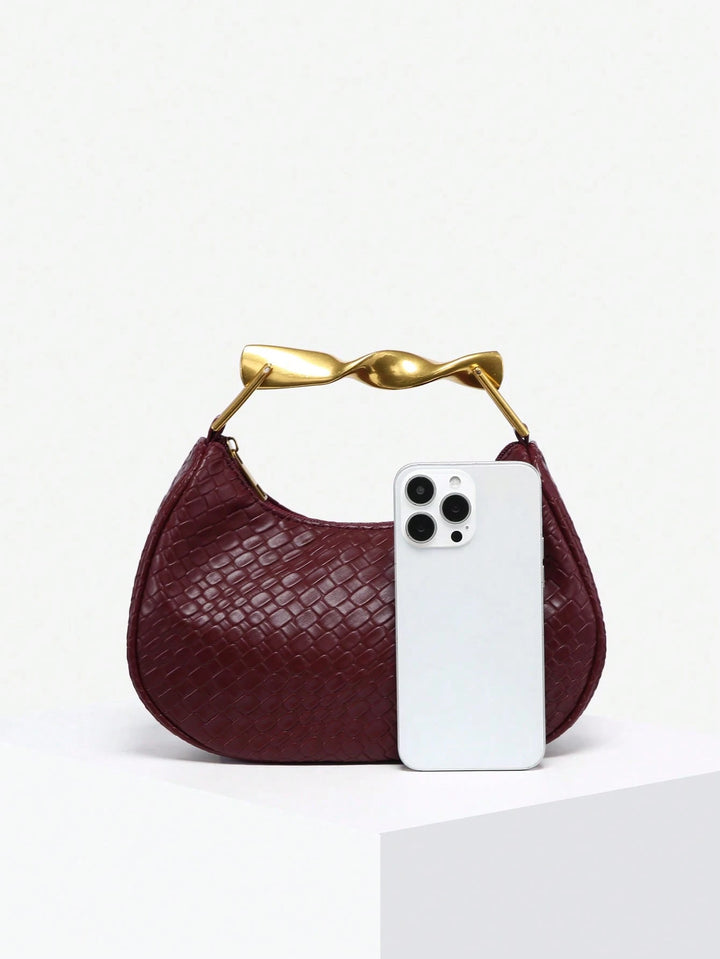 Shein - 1pc Women's Retro Simple Casual Metal Handle Decor Soft Faux Leather Angola Red Crescent Handbag