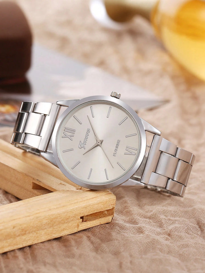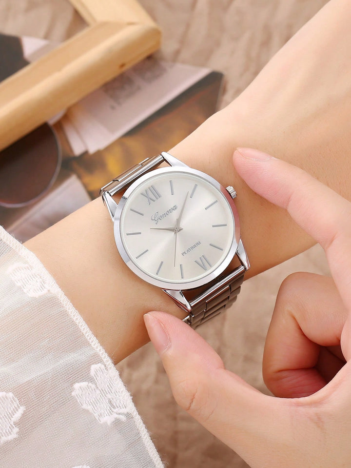 Shein - 2pcs/Set Women's Roman Numeral Dial Quartz Watch With Steel Band + Gemstone Butterfly Bracelet
