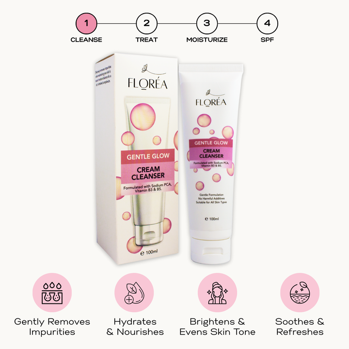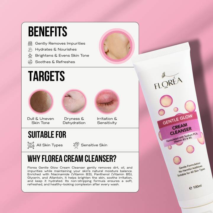 Florea Gentle Glow Cream Cleanser offers a gentle yet effective cleanse, removing dirt, oil, and impurities without stripping the skin’s natural moisture. Its nourishing formula leaves your skin feeling soft, refreshed, and balanced after every use. Perfect for all skin types, it’s your go-to solution for a healthy, radiant complexion.