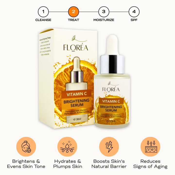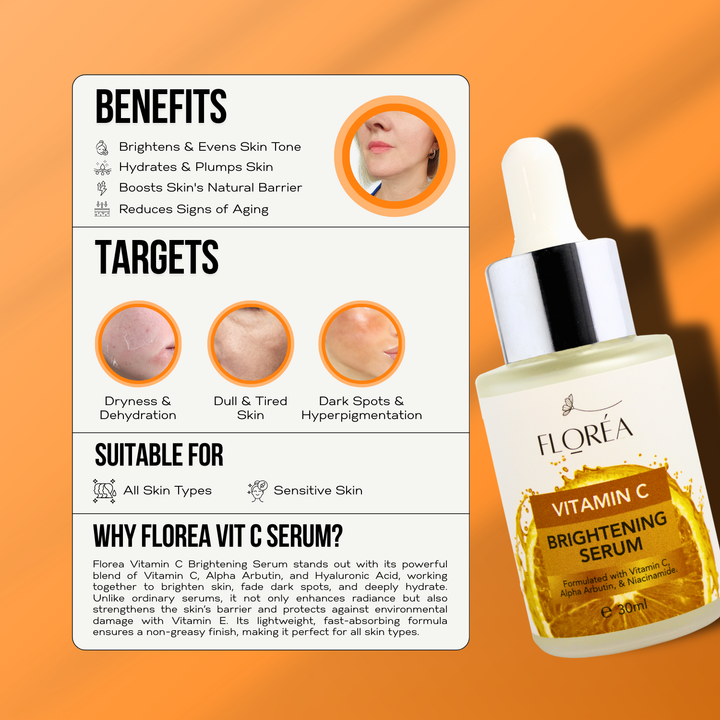 Florea Vitamin C Brightening Serum is formulated with Vitamin C, Alpha Arbutin, Niacinamide, and Hyaluronic Acid to target dark spots, smooth skin texture, and enhance hydration. This lightweight, fast-absorbing serum promotes a radiant, even-toned complexion, leaving your skin soft, glowing, and refreshed. Perfect for daily use to achieve visibly brighter skin.