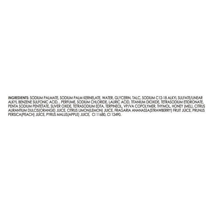 SODIUM PALMATE, SODIUM PALM KERNELATE, WATER, GLYCERIN, TALC, SODIUM C12-18 ALKYL SULFATE/LINEAR ALKYL BENZENE SULFONIC ACID, PERFUME, SODIUM CHLORIDE, LAURIC ACID, TITANIUM DIOXIDE, ETIDRONIC ACID, TOCOPHERYL ACETATE, NIACINAMIDE, PYRIDOXINE HYDROCHLORIDE, TETRASODIUM EDTA, MAGNESIUM CHLORIDE, CALCIUM CHLORIDE, TERPINEOL, THYMOL, HONEY (MEL), CITRUS AURANTIUM DULCIS (ORANGE) JUICE, CITRUS LIMON (LEMON) JUICE, FRAGRIA ANANASSA (STRAWBERRY) FRUIT JUICE, PRUNUS PERSICA (PEACH) JUICE, PYRUS MALUS (APPLE) JUICE, CI 11680, CI 12490.