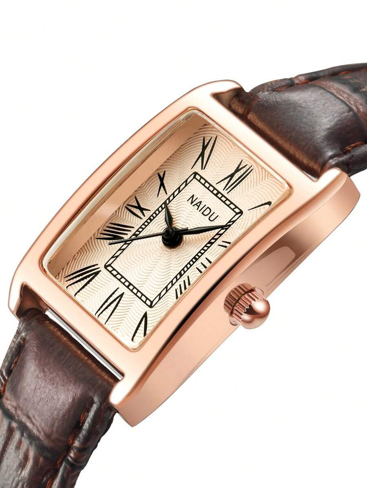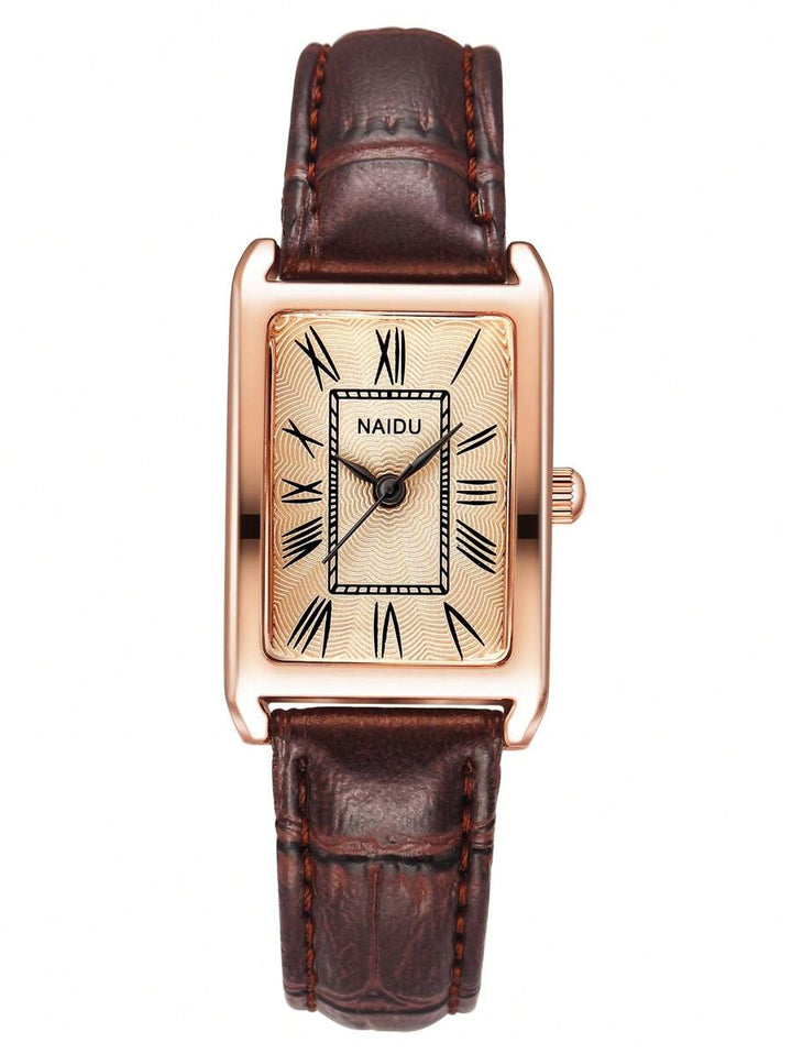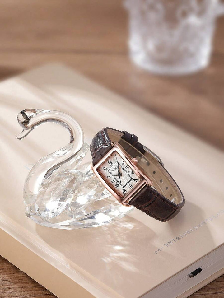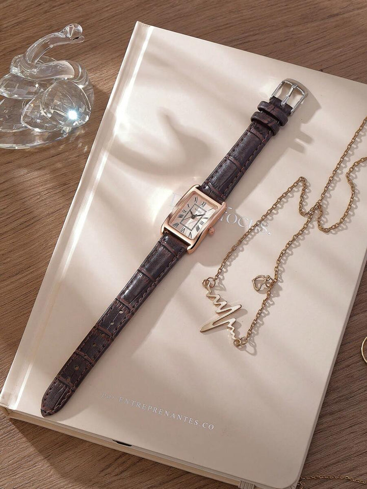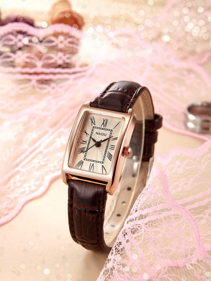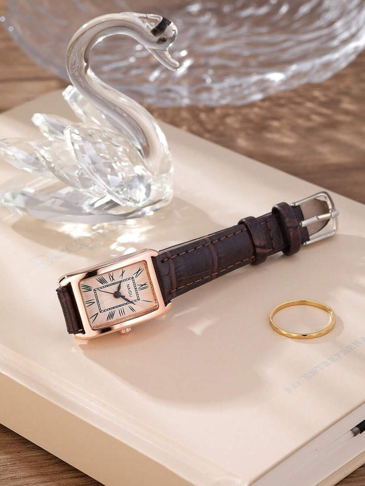 Shein - 1pc Women's Vintage Minimalist Roman Numeral Small Square Leather Belt Watch