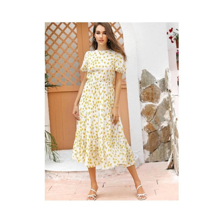 Shein- Floral Hem Tiered Hem Dress With Puff Sleeves