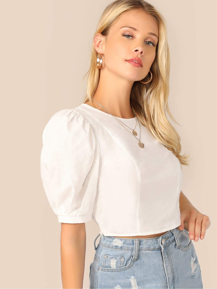 Shein- Puff Sleeve Keyhole Back Crop Top
