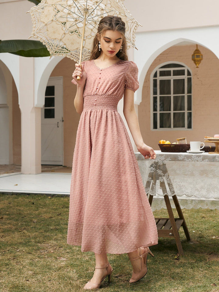 Shein- Swiss Dot Shirred Waist Puff Sleeve A-line Dress