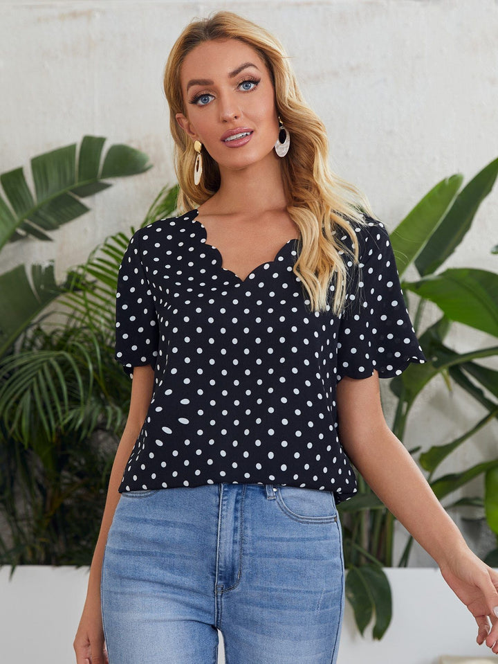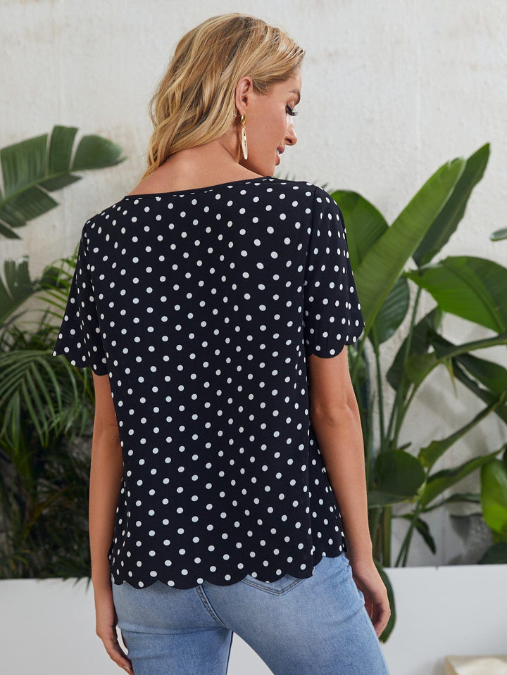 Shein- V-neck Scallop Edge Polka Dot Top
